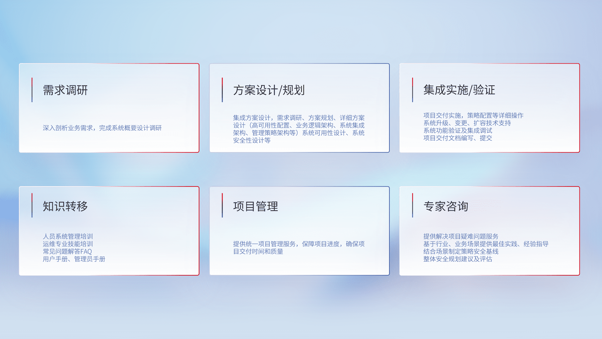 针对客户行业特性,,将宏观的安全战略和需求,,通过专业的交付服务,,实现项目落地,,,为客户提供标准规范的集成交付服务。。